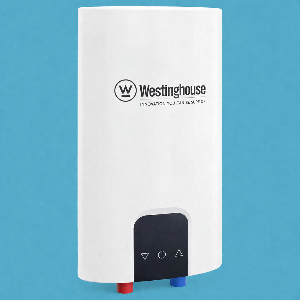 The water heater is located to the left of the toilet. It may have switched off, as even a brief power outage can cause it to shut down as a safety measure. Restarting it is very simple: just press the button located at the bottom center to turn it back on. You will see the indicator lights come back on.